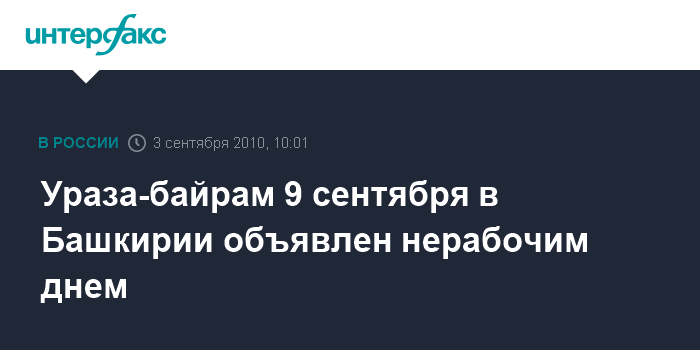 Уфа. 3 сентября. INTERFAX.RU - Министерство труда и социальной защиты Башкирии в связи с мусульманским праздником Ураза-байрам объявило нерабочим праздничным днем 9 сентября, сообщает пресс-службы правительства республики.