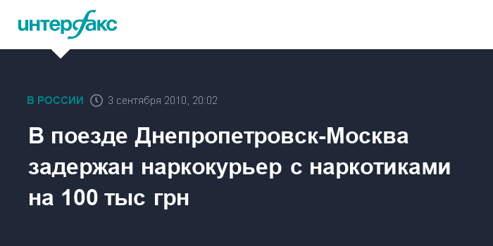 Днепропетровск. 3 сентября. INTERFAX.RU - Сотрудники Службы безопасности Украины в Днепропетровской области совместно с работниками УМВС на Приднепровской железной дороге в поезде Днепропетровск-Москва задержали местного перевозившего наркотические вещества на сумму порядка 100 тыс грн.