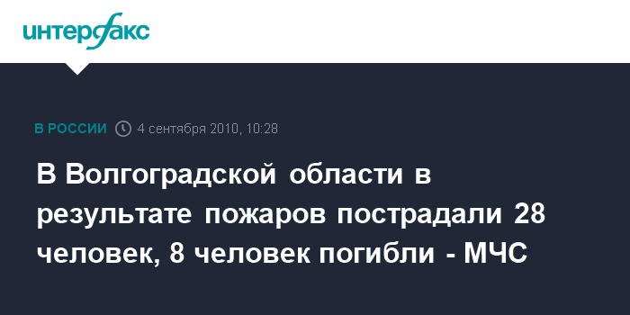 Ростов-на-Дону. 4 сентября. INTERFAX.RU - В результате ландшафтных пожаров в Волгоградской области погибли восемь человек, пострадали 28 человек, сообщили агентству "Интерфакс-Юг" в субботу в Южном региональном центре МЧС РФ. "Девять человек из числа пострадавших госпитализированы, 19 находятся на амбулаторном лечении, погибли восемь человек", - сообщил собеседник агентства.