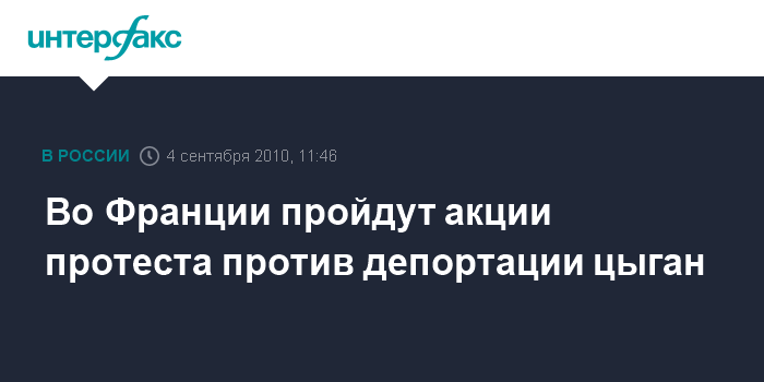 Лондон. 4 сентября. INTERFAX.RU - В Париже и других городах Франции в субботу пройдут демонстрации протеста против решения властей о высылке цыган, которые в свое время прибыли в эту страну из Румынии и Болгарии, сообщает британская телерадиокорпорация Би-би-си. Ожидается, что в Париже на улицы могут выйти около 30 тыс. недовольных решением французского правительства.