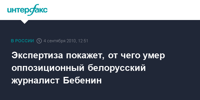 Минск. 4 сентября. INTERFAX.RU - Причину смерти оппозиционного белорусского журналиста Олега Бебенина, найденного мертвым накануне вечером на даче под Минском, установит судебно-медицинская экспертиза, сообщили агентству "Интерфакс-Запад" в субботу в пресс-центре Хартии-97. "Мы не знаем, отчего он умер. Это покажет вскрытие и экспертиза", - заявил агентству представитель Хартии-97. По его словам, "дата похорон О.Бебенина еще не известна, тело отправлено на вскрытие".