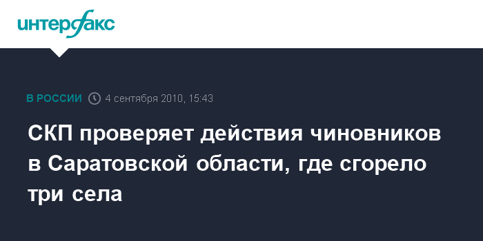 Москва. 4 сентября. INTERFAX.RU - СКП по Саратовской области проводит доследственную проверку на предмет законности действий должностных лиц при проведении противопожарных мероприятий в области, говорится в сообщении, размещенном в субботу на сайте СКП РФ. "В ходе проверки в исполнительных органах власти получены документы, обязывающие глав администраций районов принимать меры к обеспечению противопожарной безопасности. По результатам доследственной проверки будет принято процессуальное решение", - говорится в сообщении.