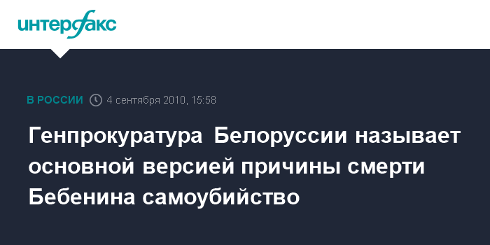 Минск. 4 сентября. INTERFAX.RU - Основной версией причины смерти белорусского оппозиционного журналиста, которую рассматривает прокуратура, является самоубийство, сообщили в Генеральной прокуратуре Белоруссии в субботу агентству "Интерфакс-Запад". "Основной версией смерти Олега Бебенина является самоубийство. Но прокуратурой будут отработаны и другие возможные версии, которые обычно отрабатываются при обнаружении трупов, висящих в петле", - сообщили в Генпрокуратуре.