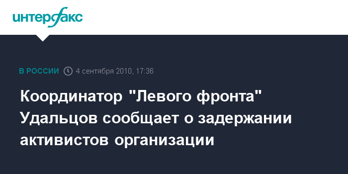 Москва. 4 сентября. INTERFAX.RU - Координатор "Левого фронта" Сергей Удальцов и несколько других активистов организации задержаны в субботу в Москве сотрудниками милиции при попытке собраться и провести совещание. "Около 16 часов недалеко от метро "Автозаводская" во дворах представители "Левого фронта" хотели собраться на своеобразное совещание, чтобы обсудить организационные моменты. Подъехала милицейская "Газель", сотрудники милиции задержали девятерых человек", - сообщил "Интерфаксу" в С.Удальцов.