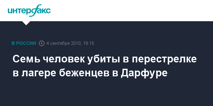 Лондон. 4 сентября. INTERFAX.RU - Не менее семи человек убиты, 20 человек получили ранения в результате перестрелки, вспыхнувшей в лагере беженцев в суданской провинции Дарфур, сообщает в субботу британская телерадиокорпорация Би-би-си со ссылкой на представителя объединенной миротворческой миссии ООН и Африканского союза. Представитель миротворцев не сообщил, что стало причиной стрельбы. По данным других западных СМИ, лагерь атаковали правительственные силы.