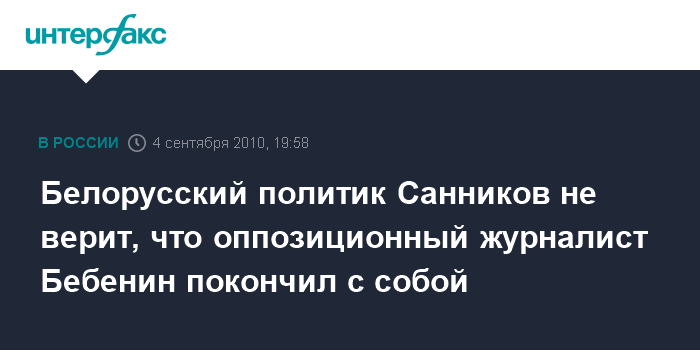 Москва. 4 сентября. INTERFAX.RU - Претендент на пост президента Белоруссии, лидер гражданской кампании "Европейская Беларусь" Андрей Санников не верит в самоубийство основателя оппозиционного сайта "Хартия-97" Олега Бебенина, который был основным членом команды А.Санникова.