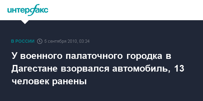 Махачкала. 5 сентября. ИНТЕРФАКС-ЮГ - По меньшей мере, 13 человек получили ранения и ожоги в результате взрыва неопознанного автомобиля в районе палаточного городка воинской части в дагестанском населенном пункте Герей-Авлак, вблизи Буйнакска.