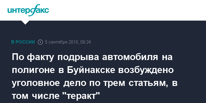 Москва. 5 сентября. ИНТЕРФАКС - Следственные органы Следственного комитета по республике Дагестан возбудили по факту подрыва автомобиля на территории военного полигона в городе Буйнакске уголовное дело.