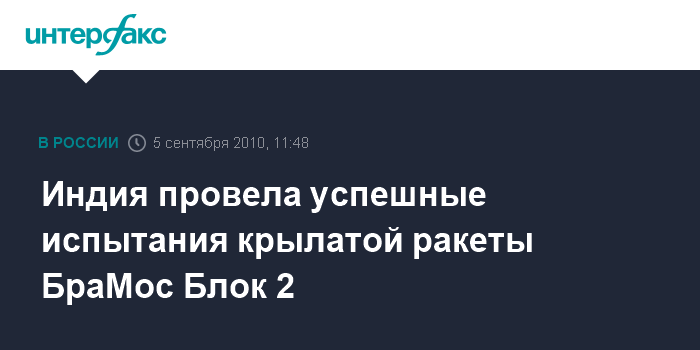 Дели. 5 сентября. INTERFAX.RU - Первое в мире пикирование крылатой ракеты на сверхзвуковой скорости было продемонстрировано в воскресенье в ходе испытаний в Индии. "Ракета была запущена сегодня в 11.35 утра с полигона Чандипур. Она совершила большое маневрирование с выходом в крутое пике, что до сих пор не могла сделать ни одна из моделей крылатых ракет, состоящих на вооружении в мире", - сообщил в воскресенье "Интерфаксу" источник в министерстве обороны Индии.