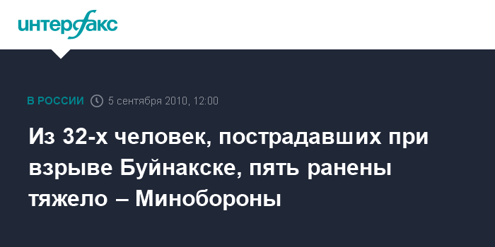 Москва. 5 сентября. INTERFAX.RU - Военные медики борются за жизнь пяти тяжелораненых военнослужащих, пострадавших в результате теракта на войсковом полигоне "Дальний" в районе Буйнакска, сообщил "Интерфаксу-АВН" в воскресенье начальник Управления пресс-службы и информации Минобороны РФ Алексей Кузнецов. 32 военнослужащих 136-й мотострелковой бригады, пострадавших в результате теракта, доставлены в местные военные госпитали, где им оказывается необходимая медицинская помощь", - заявил А.Кузнецов.