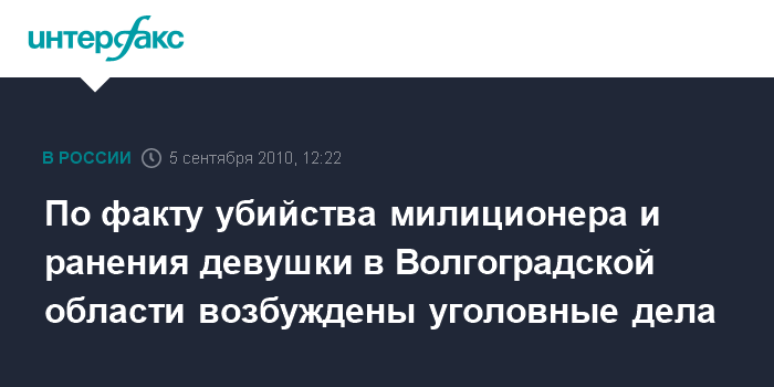 Волгоград. 5 сентября. INTERFAX.RU - Управление СКП РФ по Волгоградской области возбудило уголовные дела по факту убийства милиционера и ранения женщины в городе Суровикино. Как сообщили агентству "Интерфакс-Юг" в следственном комитете региона, уголовные дела возбуждены по ст. 317 УК РФ (посягательство на жизнь сотрудников правоохранительных органов) по ст. 30 ч. 1 ст. 105 УК РФ (покушение на убийство).