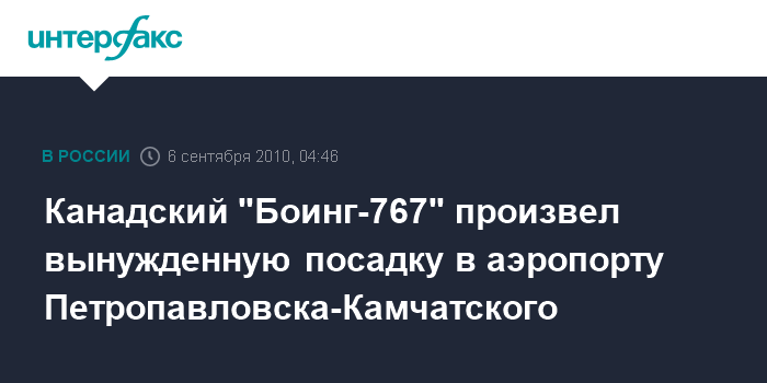 Петропавловск-Камчатский. 6 сентября. ИНТЕРФАКС-ДАЛЬНИЙ ВОСТОК - Самолет "Боинг-767" авиакомпании "Эйр Канада", на борту которого находились 162 человека, совершил вынужденную посадку в аэропорту Петропавловска-Камчатского из-за подозрения, что на борту лайнера начался пожар.