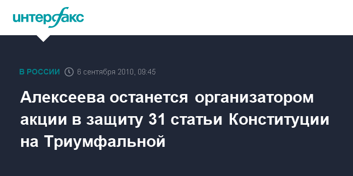 Москва. 6 сентября. INTERFAX.RU - Глава Московской Хельсинкской группы (МХГ) Людмила Алексеева решила остаться одним из организаторов митинга в защиту 31-ой статьи Конституции, который второй год подряд активисты общественных организаций пытаются организовать на Триумфальной площади.