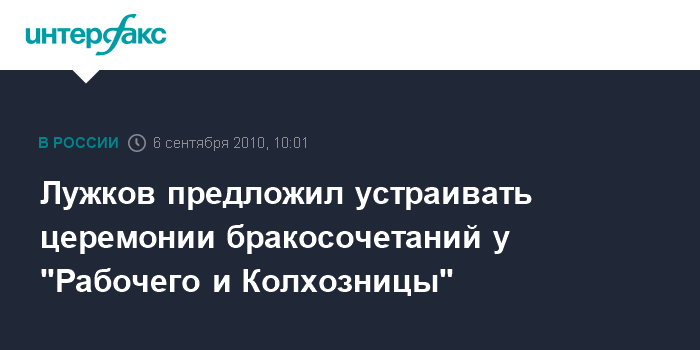 Москва. 6 сентября. INTERFAX.RU - Скульптура "Рабочий и Колхозница" может стать достойным местом для организации церемоний бракосочетания москвичей, убежден столичный градоначальник Юрий Лужков.