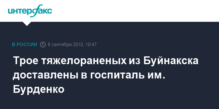Москва. 6 сентября. INTERFAX.RU - Трое тяжелораненых военнослужащих, пострадавших накануне в результате теракта на войсковом полигоне в районе Буйнакска, доставлены в Москву, сообщил "Интерфаксу" в понедельник начальник управления пресс-службы и информации Минобороны РФ Алексей Кузнецов.
