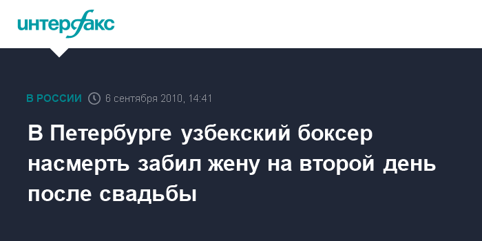 Санкт-Петербург. 6 сентября. INTERFAX.RU - В Петербурге боксер насмерть забил жену через два дня после свадьбы, сообщает сайт Следственного управления СКП по северной столице в понедельник.