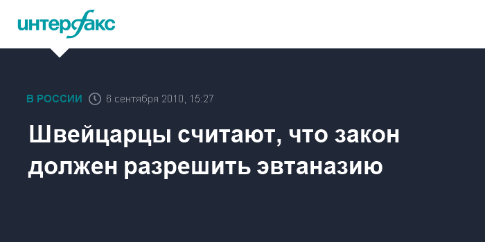 Женева. 6 сентября. INTERFAX.RU - Подавляющее большинство швейцарцев выступают за легализацию активной эвтаназии, когда по просьбе пациента врачи выписывают лекарство, приводящее к остановке жизненных функций.