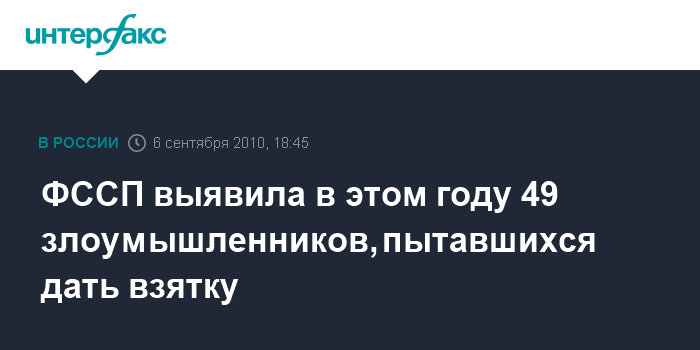 Москва. 6 августа. INTERFAX.RU - Российские судебные приставы в 2010 году выявили 49 злоумышленников, пытавшихся подкупить сотрудников Службы, что значительно больше, чем в прошлом году, сообщили в пресс-бюро ФССП.