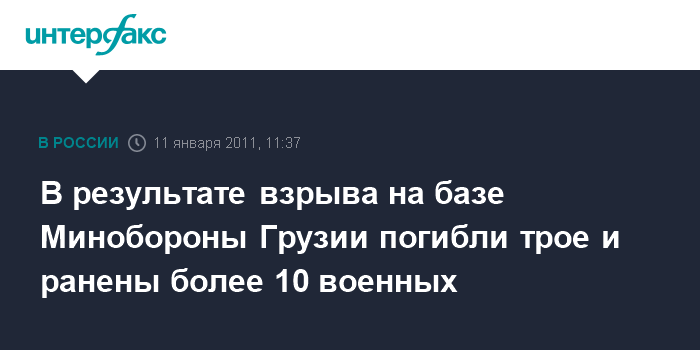 Тбилиси. 11 января. INTERFAX.RU - На территории Крцанисской военной базы Минобороны Грузии вблизи Тбилиси во вторник произошел взрыв, в результате которого, по предварительным, данным погибли трое военнослужащих и более 10 ранены, сообщают грузинские СМИ.