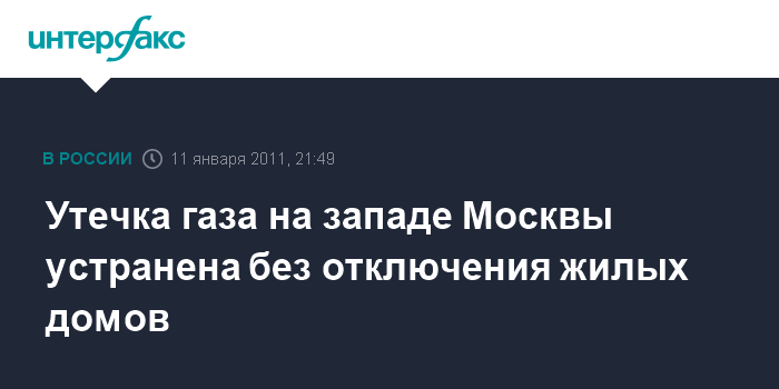 Москва. 11 января. INTERFAX.RU - Утечка газа на западе Москвы устранена, сообщили "Интерфаксу" в пресс-службе ГУП "Мосгаз" во вторник.