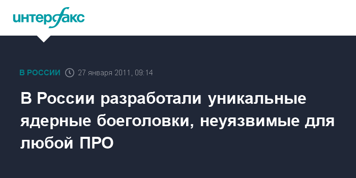 Москва. 27 января. INTERFAX.RU - Разработанное в России новое ядерное боевое оснащение межконтинентальных баллистических ракет сможет преодолеть все существующие и перспективные системы противоракетной обороны, заявил генконструктор Московского института теплотехники (МИТ) Юрий Соломонов.