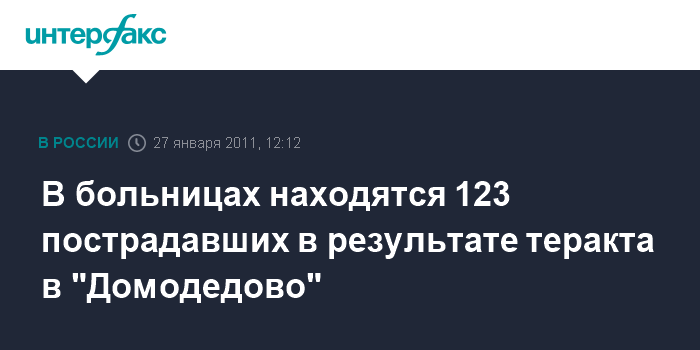Москва. 27 января. INTERFAX.RU - Количество пострадавших в результате теракта в аэропорту "Домодедово" составляет 123 человека, среди них 16 иностранных граждан, сообщает в четверг Минздравсоцразвития.