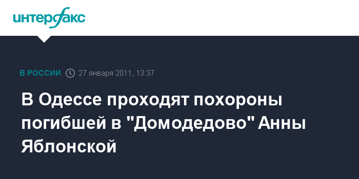 Одесса. 27 января. INTERFAX.RU - Прощание и похороны погибшей во время теракта в аэропорту "Домодедово" драматургом Анной Машутиной (псевдоним Яблонская) начались в четверг в Спасо-Преображенском соборе Одессы в 12:00, сообщили корреспонденту агентства "Интерфакс" знакомые погибшей.