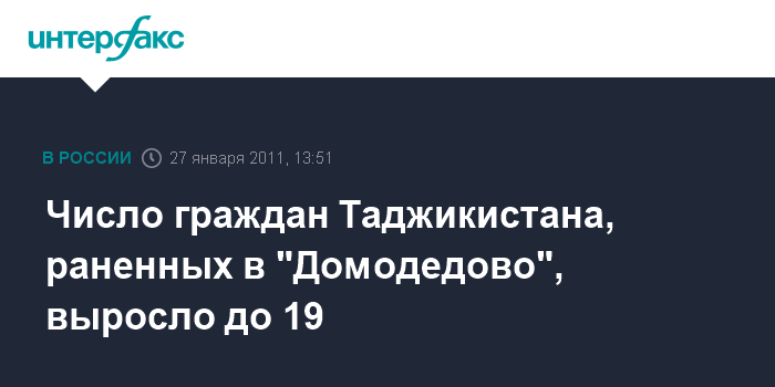 Душанбе. 27 января. INTERFAX.RU - Количество пострадавших граждан Таджикистана при взрыве в московском аэропорту Домодедово увеличилось с 16 до 19 человек, сообщил в четверг "Интерфаксу" глава оперативного штаба по оказанию помощи соотечественникам посольства республики в Москве Турабек Назаров.