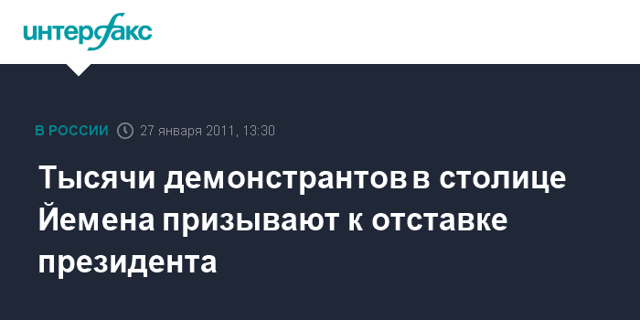 Лондон. 27 января. INTERFAX.RU - Несколько тысяч протестующих на улицах и площадях Саны, столицы Йемена, в четверг призвали уйти в отставку президента страны Али Абдаллу Салеха, находящегося у власти уже более 30 лет, сообщила BBC.