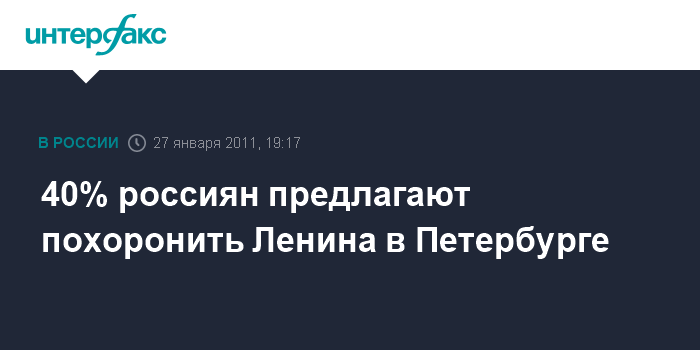 Москва. 27 января. INTERFAX.RU - Тело Владимира Ленина должно быть перезахоронено на Волковом кладбище в Санкт-Петербурге, где покоятся его мать и сестры, считает 40% россиян. Таковы данные опроса, проведенного 21-24 января социологами "Левада-Центра".