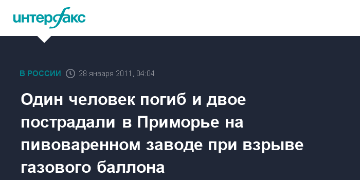 Владивосток. 28 января. ИНТЕРФАКС-ДАЛЬНИЙ ВОСТОК - На одном из предприятий по производству пива в приморском городе Дальнегорске в четверг взорвался баллон с углекислым газом, в результате чего один рабочий погиб, еще двое получили ранения.