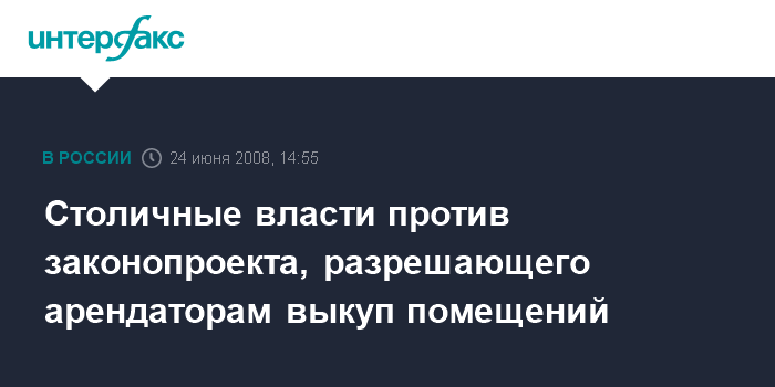 Москва. 24 июня. INTERFAX.RU - Московские власти выступают против предстоящего принятия Госдумой РФ во втором чтении законопроекта, позволяющего арендаторам выкупать у города помещения.