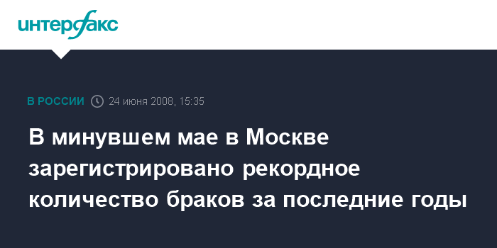 Москва. 24 июня. INTERFAX.RU - Несмотря на известное суеверие, прошедший май стал рекордным по количеству браков, заключенных в столице за последние годы, сообщила "Интерфаксу" заместитель начальника управления ЗАГС по Москве Татьяна Ушакова.