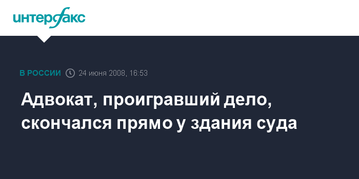 Москва. 24 июня. INTERFAX.RU - Правоохранительные органы Ставрополя выясняют обстоятельства смерти адвоката - пожилого мужчины, который днем во вторник скончался прямо у здания Ставропольского краевого суда, после того, как "проиграл" гражданское дело.