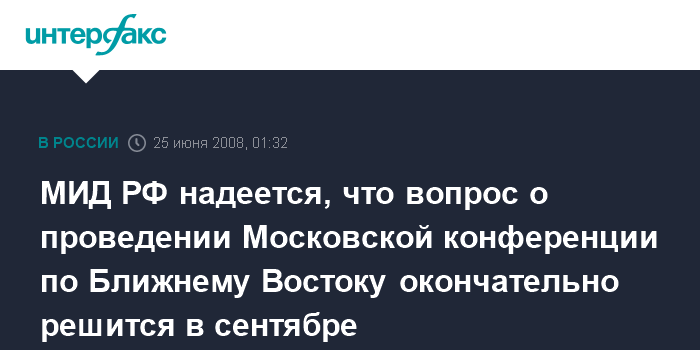 "Если на встрече "квартета" международных посредников по Ближнему Востоку в итоговом заявлении было просто зафиксировано, что участники обсудили предложение России, то теперь сказано, что уже на нашей встрече в сентябре мы определимся после дополнительных консультаций со сторонами, со сроками и повесткой дня Московской встречи", - заявил журналистам глава МИД РФ по пути из Берлина в Москву.