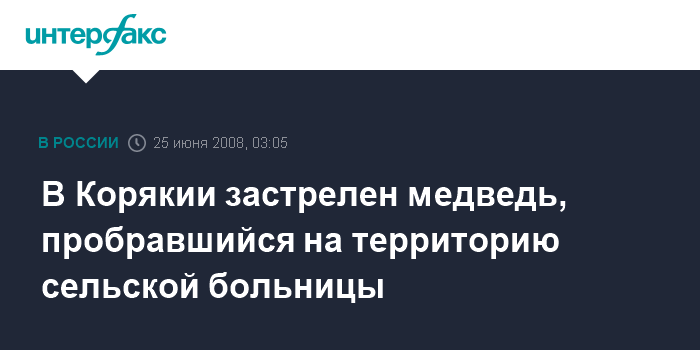 Петропавловск-Камчатский. 25 июня. ИНТЕРФАКС-ДАЛЬНИЙ ВОСТОК - В селе Каменское Пенжинского района Корякского округа (Камчатский край) застрелен медведь, забредший на территорию местной больницы и напугавший пациентов.