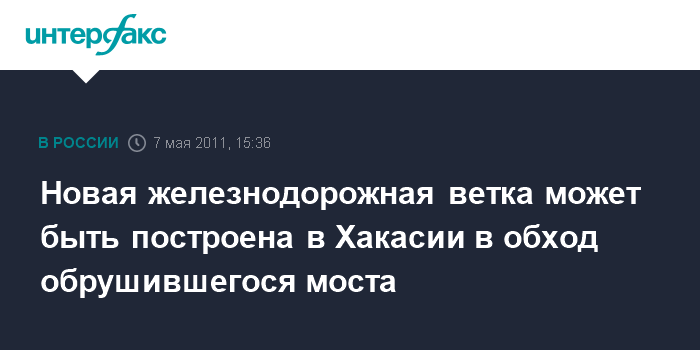 Один пролет железнодорожного моста рухнул в субботу в 3:20 мск в реку Абакан в Республике Хакасия в 7 км от станции Камышта на территории Аскизского района. Пострадавших нетю Причиной обрушения стал подмыв одной из опор моста. Один пролет упал краем в воду, еще один пролет находится в подвешенном состоянии и опирается на наклоненную опору.