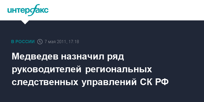 Москва. 7 мая. INTERFAX.RU - Президент России Дмитрий Медведев подписал указ о назначении на должность руководителей следственных управлений Следственного комитета России в девяти регионах страны. Назначены руководители в Смоленской, Курской, Сахалинской, Ярославской, Брянской, Ивановской и Орловской областях, сообщает в субботу сайт Кремля.