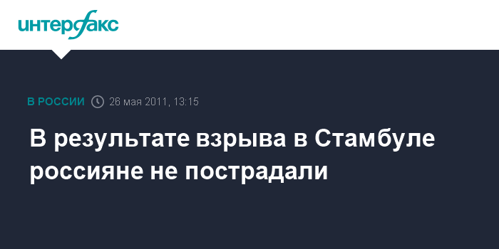 Москва. 26 мая. INTERFAX.RU - Российских граждан среди пострадавших в результате взрыва, произошедшего в Стамбуле в четверг, нет, сообщили порталу "Интерфакс-Туризм" в отделе прессы посольства Турецкой Республики в Москве.