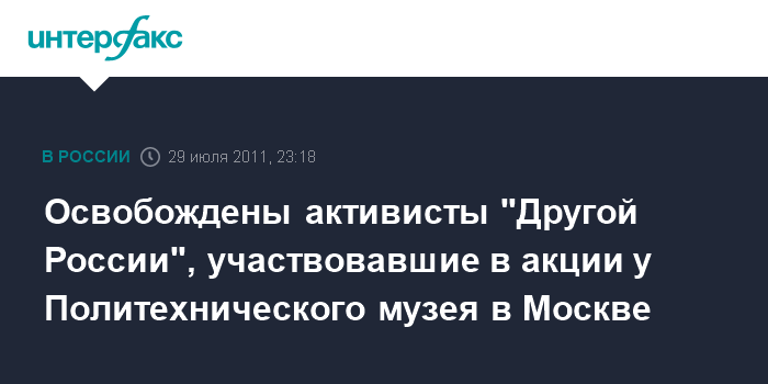 Москва. 29 июля. ИНТЕРФАКС - Двое активистов незарегистрированной оппозиционной партии "Другая Россия", задержанные в пятницу вечером в Москве после того, как они вывесили на фасаде Политехнического музея плакат в поддержку своей арестованной соратницы Таисии Осиповой, освобождены.