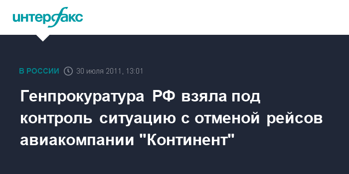 Москва. 30 июля. INTERFAX.RU - Генеральная прокуратура РФ взяла под контроль ситуацию с отменой рейсов авиакомпании "Континент", заявила в субботу "Интерфаксу" официальный представитель ведомства Марина Гриднева.