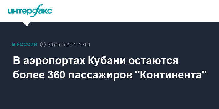 Сочи. 30 июля. INTERFAX.RU - Более 360 пассажиров обанкротившейся авиакомпании "Континет" еще предстоит отправить из аэропортов Краснодарского края в субботу, сообщил агентству "Интерфакс-Юг" генеральный директор компании "БазЭл Аэро" Сергей Лихарев. "В аэропортах Кубани до вечера остаются 363 пассажира, которые не смогли улететь авиалайнерами компании "Континент", - сказал он. По словам Лихарева, пассажиры находятся в аэропортах Сочи, Краснодара и Анапы.