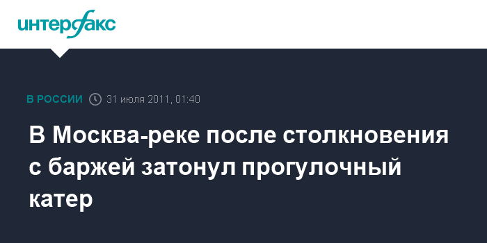 Москва. 31 июля. ИНТЕРФАКС - В центре Москвы в водах Москва-реки в районе Лужнецкой набережной напротив спорткомплекса "Лужники" произошло столкновение баржи и малого прогулочного катера, сообщили "Интерфаксу" источник в правоохранительных органах.