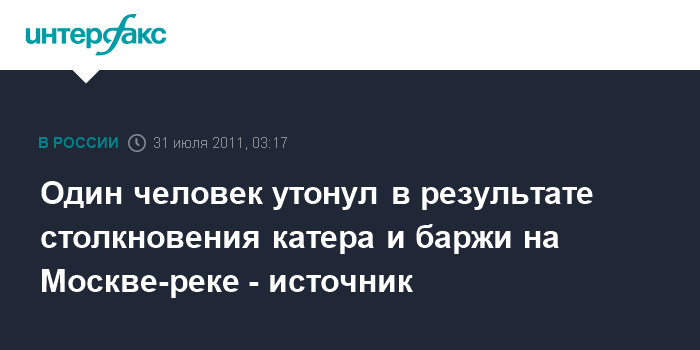 Москва. 31 июля. ИНТЕРФАКС - В результате столкновения катера "Ласточка" и баржи на Москве-реке в районе Лужнецкой набережной погиб один человек, сообщил "Интерфаксу" источник в правоохранительных органах столицы.