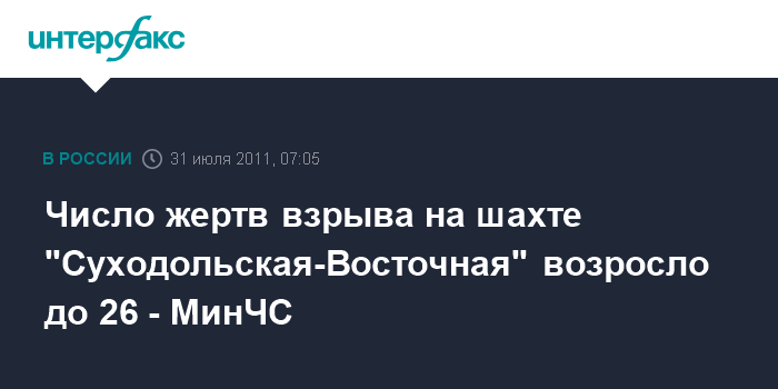 Киев. 31 июля. ИНТЕРФАКС-УКРАИНА - Число жертв взрыва метановоздушной смеси на шахте "Суходольская-Восточная" (город Суходольськ Краснодонского района Луганской области) по состоянию на 7:30 мск воскресенья возросло до 26 человек, спасатели завершили поиск числившихся пропавшими без вести, сообщает пресс-служба МинЧС.