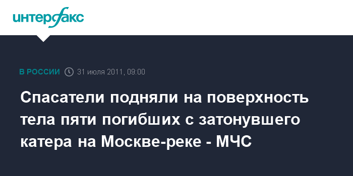 Москва. 31 июля. ИНТЕРФАКС - Спасателям МЧС РФ удалось поднять на поверхность тела пяти погибших при крушении прогулочного катера на Москва реке, заявил журналистам замначальника ГУ МЧС РФ по Москве Юрий Беседин.