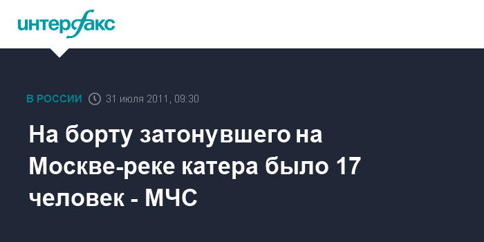 Москва. 31 июля. INTERFAX.RU - На борту затонувшего на Москве-реке катера находилось 17 человек, сообщили "Интерфаксу" в управлении информации МЧС РФ. "По уточненным данным, на борту находилось 17 человек, в том числе капитан", - отметил представитель управления. При этом спасти удалось лишь семь человек, тела еще пятерых извлечены на поверхность.