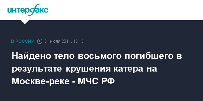 Москва. 31 июля. INTERFAX.RU - Спасатели нашли тело еще одного погибшего в результате крушения прогулочного катера на Москве-реке в ночь на воскресенье, сообщила журналистам представитель управления информации МЧС РФ Елена Смирных. "Уже найдено восьмое тело погибшего, судьба еще одного пассажира неизвестна", - сказала она.