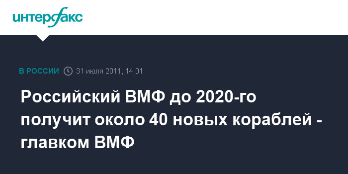 Москва. 31 июля. INTERFAX.RU - Государственная программа вооружения, рассчитанная до 2020 года, предусматривает строительство для ВМФ около 40 кораблей различных классов, сообщил "Интерфаксу-АВН" в воскресенье главком МВФ России адмирал Владимир Высоцкий. "Около 40 боевых кораблей различных классов", - сказал он о планах обновления ВМФ России.