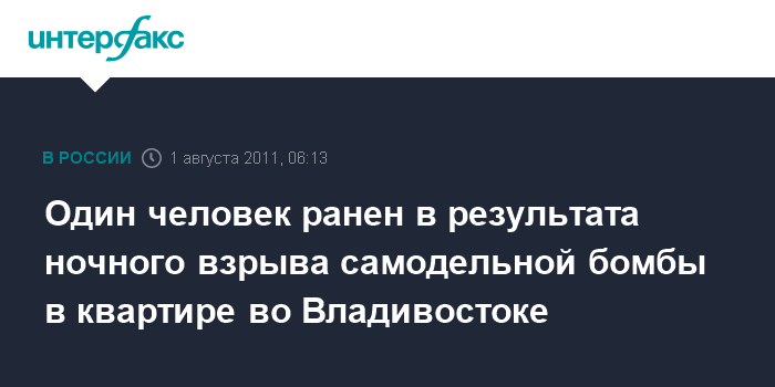 Владивосток. 1 августа. ИНТЕРФАКС-ДАЛЬНИЙ ВОСТОК - Взрыв самодельной бомбы прогремел в ночь на понедельник в квартире одного из домов во Владивостоке, один человек получил ранения и госпитализирован.